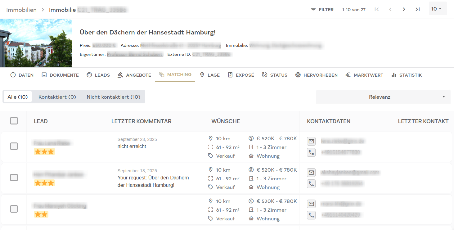 Nutzen Sie detaillierte Berichte, automatisierte Nachverfolgungen und Echtzeit-Einblicke für intelligentere Entscheidungen. So verschaffen Sie sich ohne zusätzlichen Aufwand einen Wettbewerbsvorteil auf dem deutschen Immobilienmarkt.